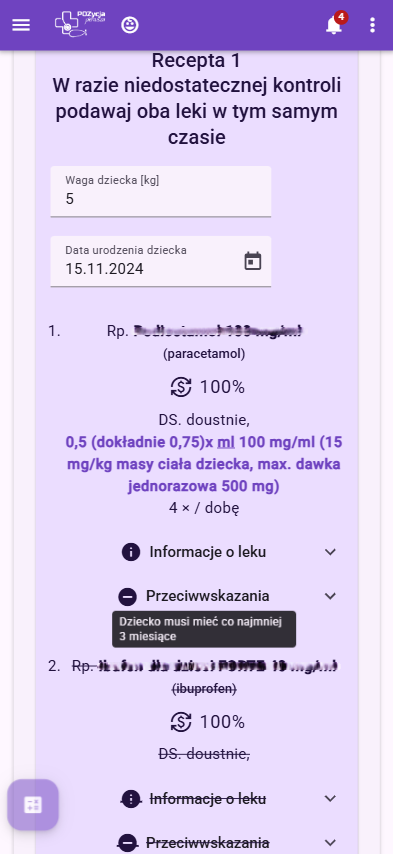 Przykładowe recepty zawierające dostosowane dawkowanie, nazwę handlową substancji czynnej, zalecany czas terapii, przeciwwskazania oraz wskazania refundacyjne wraz z poziomami odpłatności.